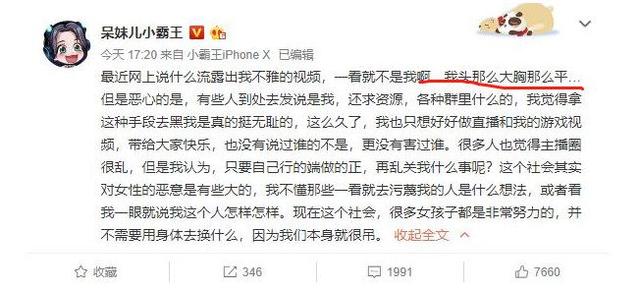 呆妹兒一直以來的形象都是非常清新和自然的,過去在熊貓直播平台表現並非特別亮眼,但她跳槽到鬥魚直播後開始聲名大噪,但是人紅是非多,在去年時就曾就出有呆妹兒7分鐘的不雅影片外流,消息一出後呆妹兒也在微博上發文澄清:「最近網上說什麼流露出我不雅視頻,一看就不是我啊...我頭那麼大胸那麼平」、「很多人覺得直播圈很亂,但是我認為,只要自己行的端做的正,再亂關我什麼事呢?」,試圖力破不雅影片的傳言。