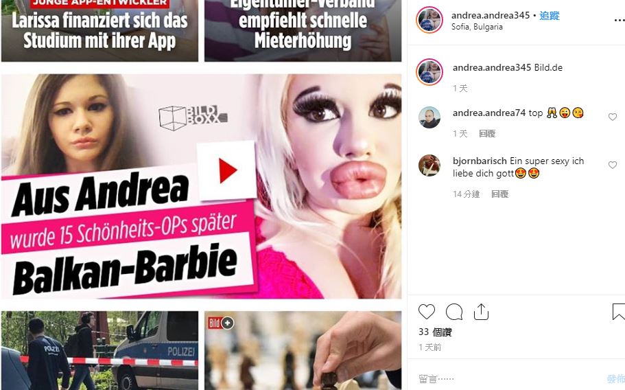 近期,一名年僅22歲還是大學生的保加利亞網紅Andrea Ivanova,因為擁有不科學的豐滿上圍和豐唇,讓他登上新聞國際版面。據報導,Andrea Ivanova從小就夢想擁有芭比娃娃般的外表,他透露從2018年開始一整年動手術超過15次更說到「也許更多,我沒有認真算」,整形前後,讓他的胸部明顯大幅充氣,透過鏡頭由下往上拍相當驚人。