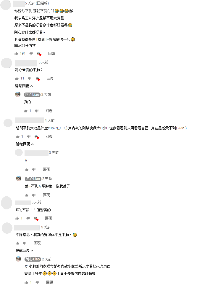 影片上傳之後,網友則紛紛留言:「你說你平胸 那我不就內凹」、「阿心真的平胸?」、「想問平胸大概是什麼cup?」、「不好意思,我真的覺得你不是平胸」,而對此阿心則回覆自己真的平胸,公開「不到A」,「ㄜ 小胸的內衣通常都有內建水餃墊所以才看起來有東西 實際上根本☹️☹️☹️千萬不要相信你的眼睛喔」。