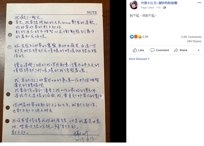 一直都把謝忻當成好朋友的Grace遭兩人背叛,謝忻昨晚公開自己的手寫信向對方道歉,「我非常非常的對不起妳,對於自己的不理智以及衝動感到萬分地羞恥及悔恨。」坦承自己讓友情變調,讓亦師亦友的情感跨越那條線。不過這份道歉信卻讓網友們看了更生氣,認為謝忻的道歉沒有誠意,且兩人都不斷強調「那條線」,連道歉都要「同款」,無法平息網友們心中的怒火。