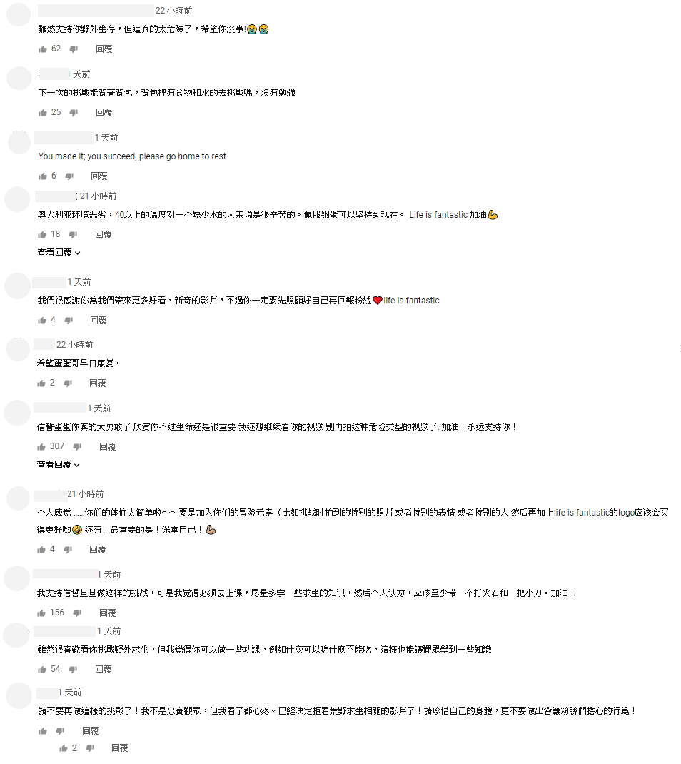 影片上傳後,網友紛紛留言:「雖然支持你野外生存,但這真的太危險了,希望你沒事!」、「澳大利亞環境惡劣,40以上的溫度對一個缺少水的人來說是很辛苦的」、「你一定要先照顧好自己再回報粉絲」、「希望以後不要拍挑戰生存了」、「感覺這樣的內容已經不是讓人覺得開心跟想看」、「不要拿自己的生命做拍片的素材阿」、「請不要再做這樣的挑戰了!我不是忠實觀眾,但我看了都心疼。已經決定拒看荒野求生相關的影片了!請珍惜自己的身體,更不要做出會讓粉絲們擔心的行為!」,希望鋼蛋真的要好好愛惜自己的生命。