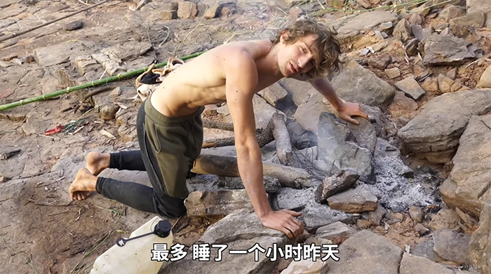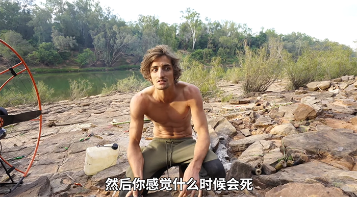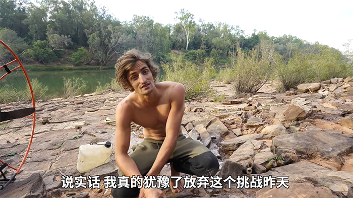 後來影片也記錄了鋼蛋打水、製作魚竿釣魚等等經過,他甚至還找了一隻蚱蜢直接吃掉,看得出身體狀況十分不好,「今天可能是這個挑戰最後一天,我可能就放棄吧」。鋼蛋表示因為那裏的氣溫高達40度以上,食物、水源又嚴重缺乏,「我找了整個世界最難求生的地方之一,感覺我失敗了」,完全是心力交瘁的狀態。