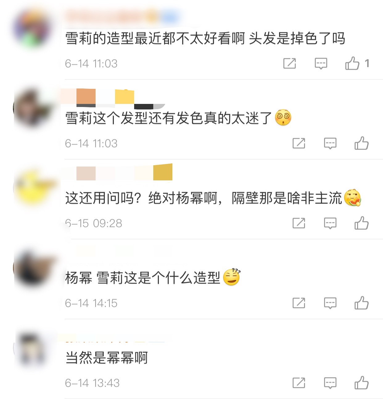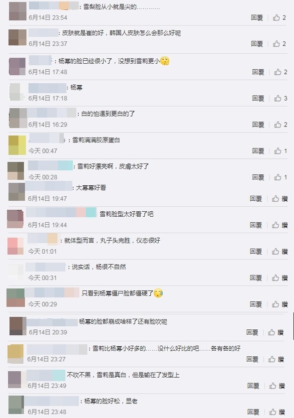 楊冪和崔雪莉同台亮相活動,分別為大陸和韓國當紅女神,兩人都擁有精緻的五官,皆選擇黑裙做為禮服的顏色,此次同框比美,有網友認為,「雪莉這個髮型還有髮色真的太美了」,但另一方面有網友認為:「雪莉造型師有問題」。網友認為整體楊冪氣質勝出,「楊冪真的美」,也有不少網友認為:「楊冪的額頭太大」、「楊冪髮際線...」,引發正反兩極的評價。