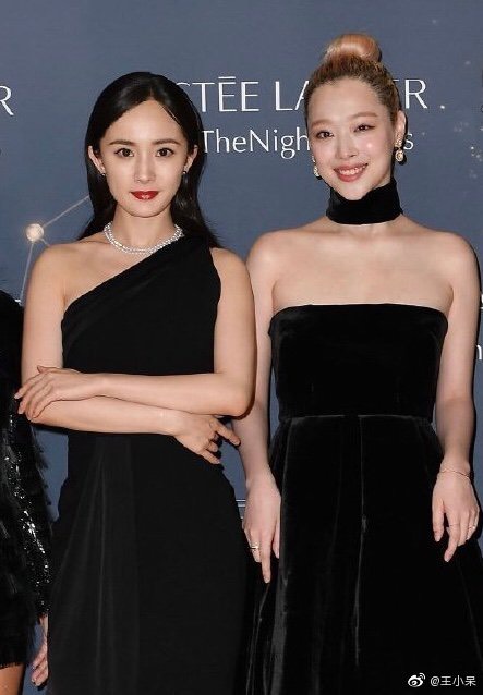 此次兩位女神共同出席義大利美妝品牌活動,只見楊冪身穿斜肩黑色長禮服,一頭黑長髮整齊在背後,精緻的淡妝搭配紅唇,顯得優雅端莊,頸上的珍珠項鍊,點綴了黑色長禮服不失單調。崔雪莉作為90年後演員,身穿一字黑禮裙,將頭髮全部盤上成丸子頭,腳穿一字小涼鞋,抹胸設計顯得性感,面帶笑容的她,散發出青春甜美氣息。