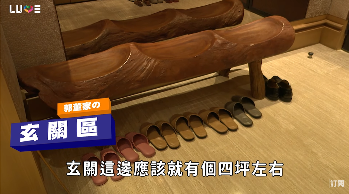 之後,「Joeman」便隨著郭董進到了這個位在台北信義區約有一百多坪的家宅中,兩人一路參觀了玄關、客廳、書房、屏風區、會客室和臥房等區域,一路上郭董也詳盡地為「Joeman」做介紹,其中也提到家宅的裝潢皆是前屋主所留下的,郭董表示「我看那個裝潢,要花很多錢」,因此決定維持原貌,也讓一旁的「Joeman」不禁問道「你也有差」,十分逗趣。