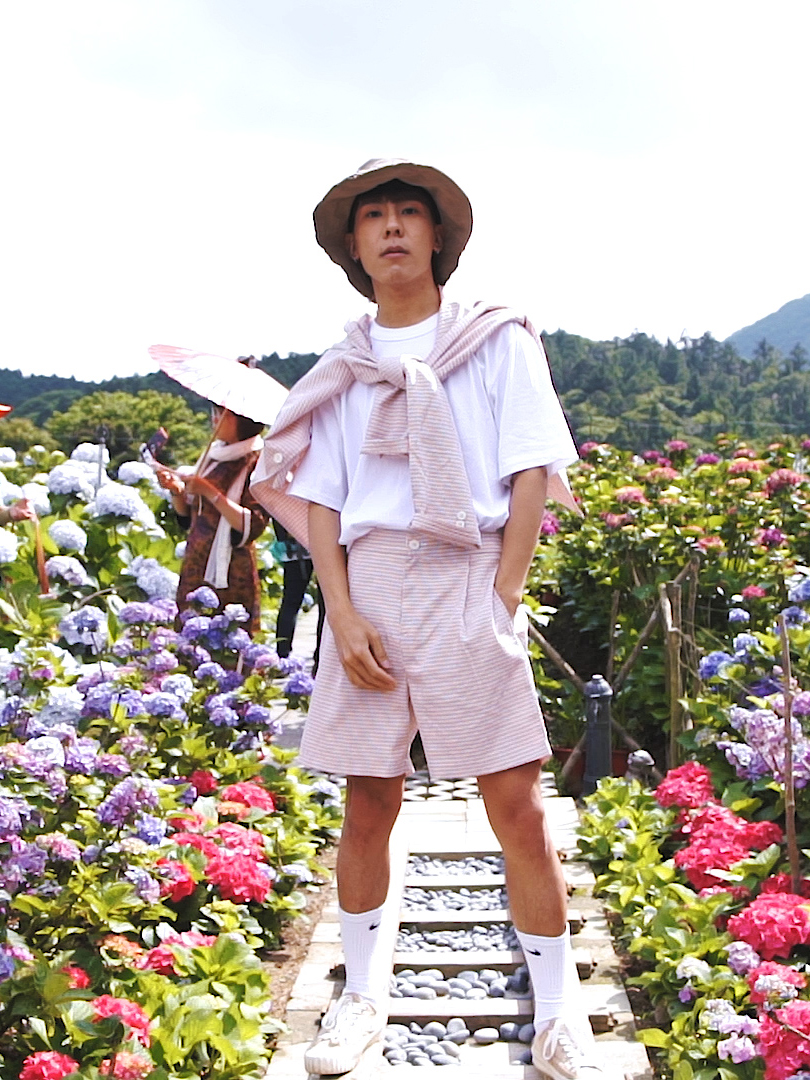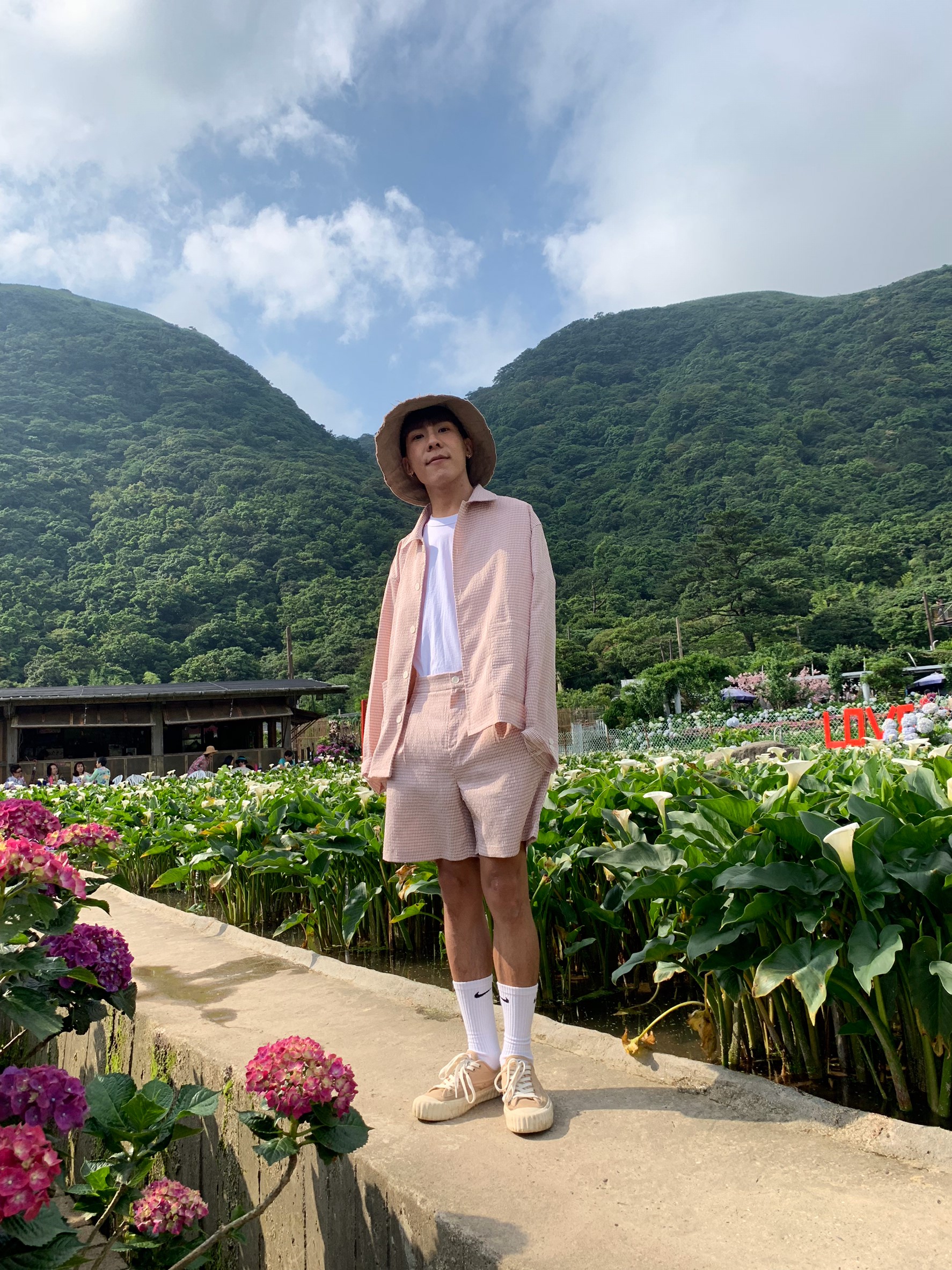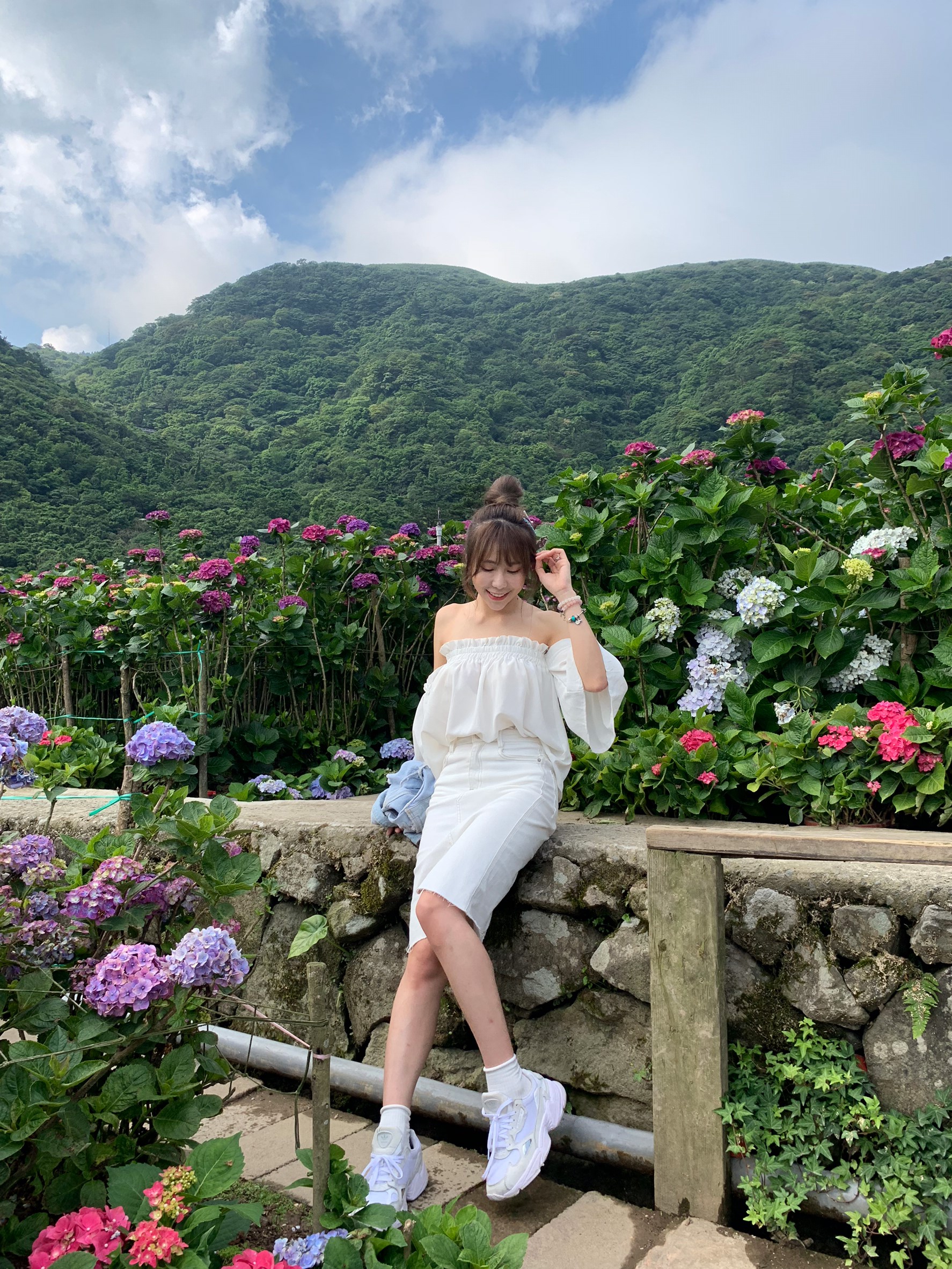 穿搭其實是能否拍出一張好照片的大重點呀! 大家可以依據前往拍照的地點去挑選衣服的顏色,若是像繡球花田這種充滿綠色的大自然場景,就幫自己挑選淺色系的衣服吧!像是林進的淡紅色襯衫搭配白色素T,以及梓梓的淺藍色牛仔外套搭配全白色上衣與窄長裙,就能融入繡球花們成為萬叢中的焦點了!