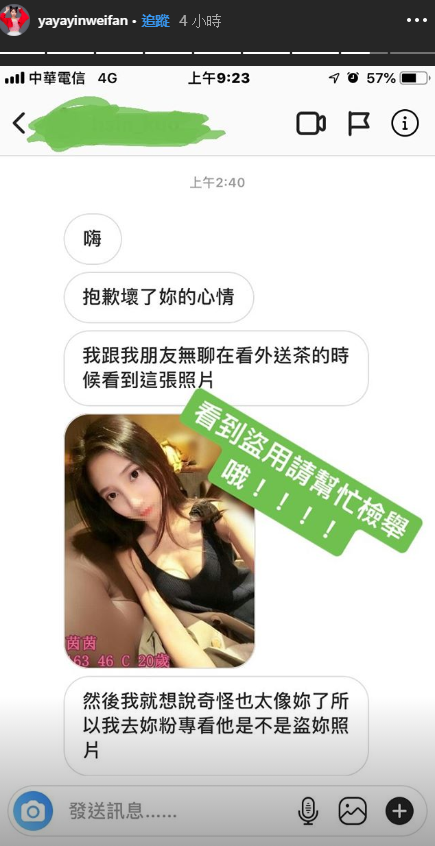 丫丫今日在IG中分享網友和自己的對話,原來是網友告知她的圖片遭到盜用!只見網友打上:「嗨,抱歉壞了妳的心情,我跟我朋友無聊在看外送茶的時候看到這張照片,然後我就想說奇怪也太像妳了,所以我就去妳粉專看她是不是盜用妳照片」,沒想到經過網友查證,竟果真發現照片中的女生就是是丫丫本人,而丫丫看見後,也無奈打上:「看到盜用請幫忙檢舉喔!」