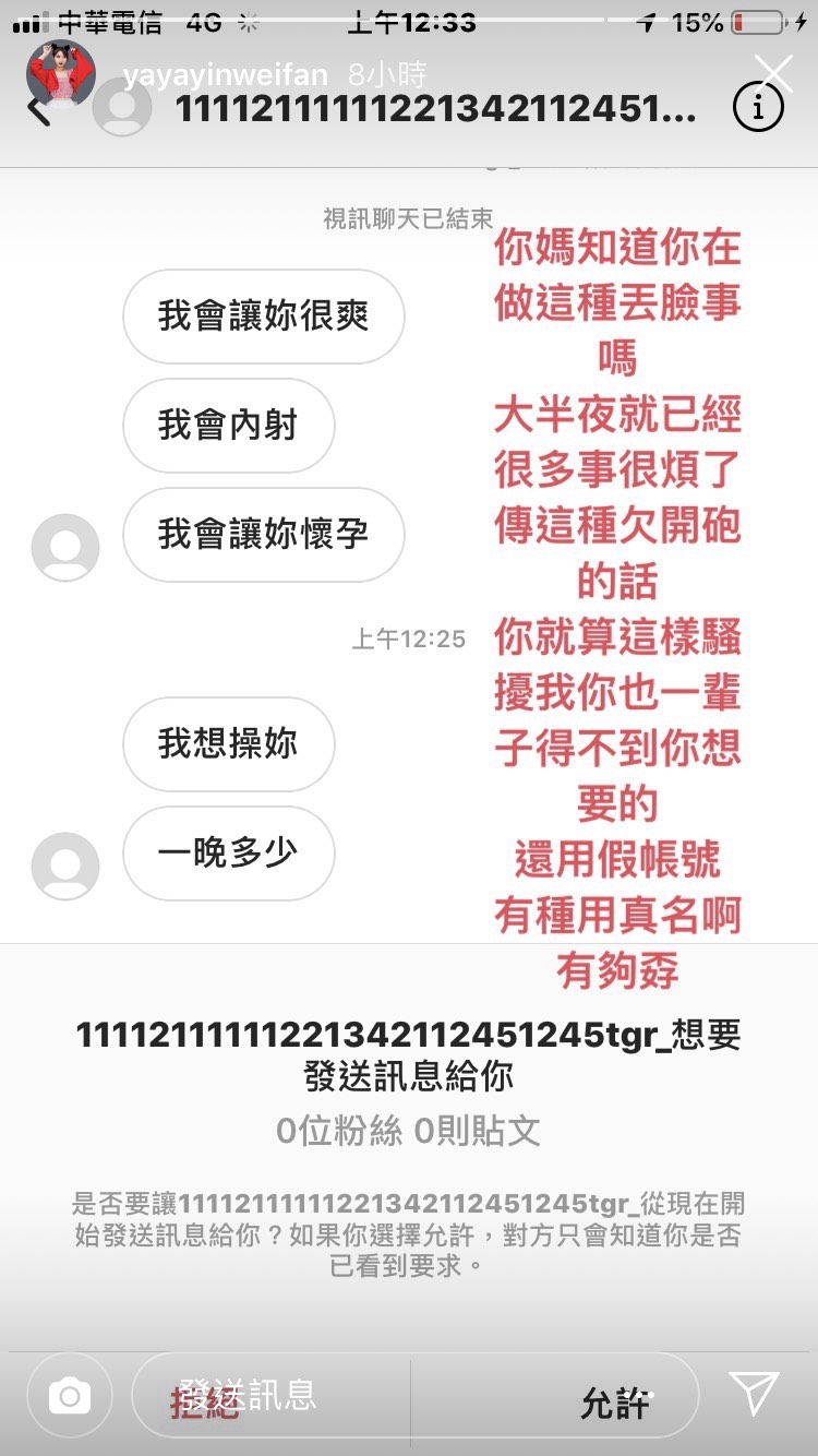 事實上丫丫本月5日才在IG中公開自己遭到騷擾的訊息,「我會讓你很爽,我會內X,我會讓妳懷孕,我想X你,一晚多少」,一連串的變態訊息讓丫丫不堪其擾,也爆氣回應:「你媽知道你在做這種丟臉事嗎?」、「大半夜就已經很多事很煩了,傳這種欠開炮的話,你就算這樣騷擾我,你也一輩子得不到想要的」,引起許多關注。