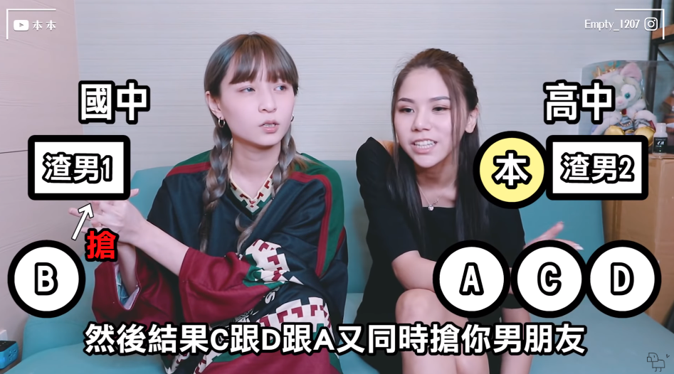 近日本本上傳新影片,也在其中分享了自己過去遇到渣男的情史,她也提到其實以前在影片中就有提過渣男前男友,不過其實還有許多故事都沒有分享過!本本表示自己學生時期碰到一位學長,當時他每節下課都會送巧克力、飲料給她,不過在學校時又不會和她連絡,反倒是放學後才會和她傳情,不過後來某次教官竟質問她:「為什麼要介入別人感情?」她才知道自己竟在不知情的情況下當了別人的小三。