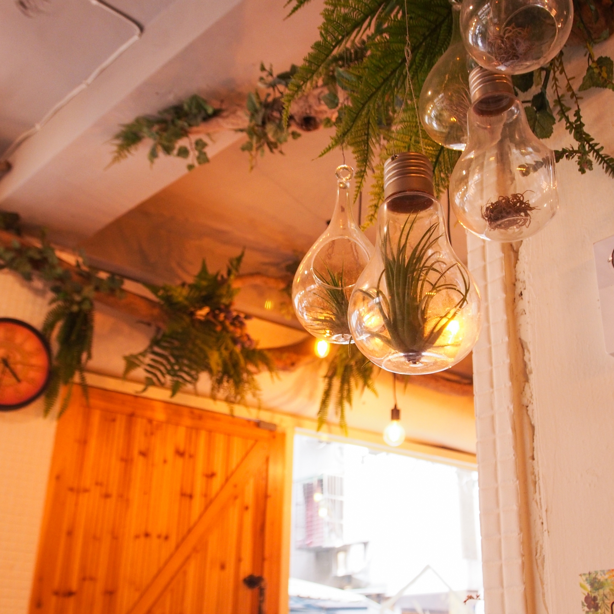 隱身在巷弄內的"伍伍零-咖啡與餐",店內裝潢是以植物與乾燥花下去做設計,暖色系的鎢絲燈與綠色交互出輕鬆舒服的氛圍,推開大大的木門後,你一定會喜歡上這間小小的咖啡廳。