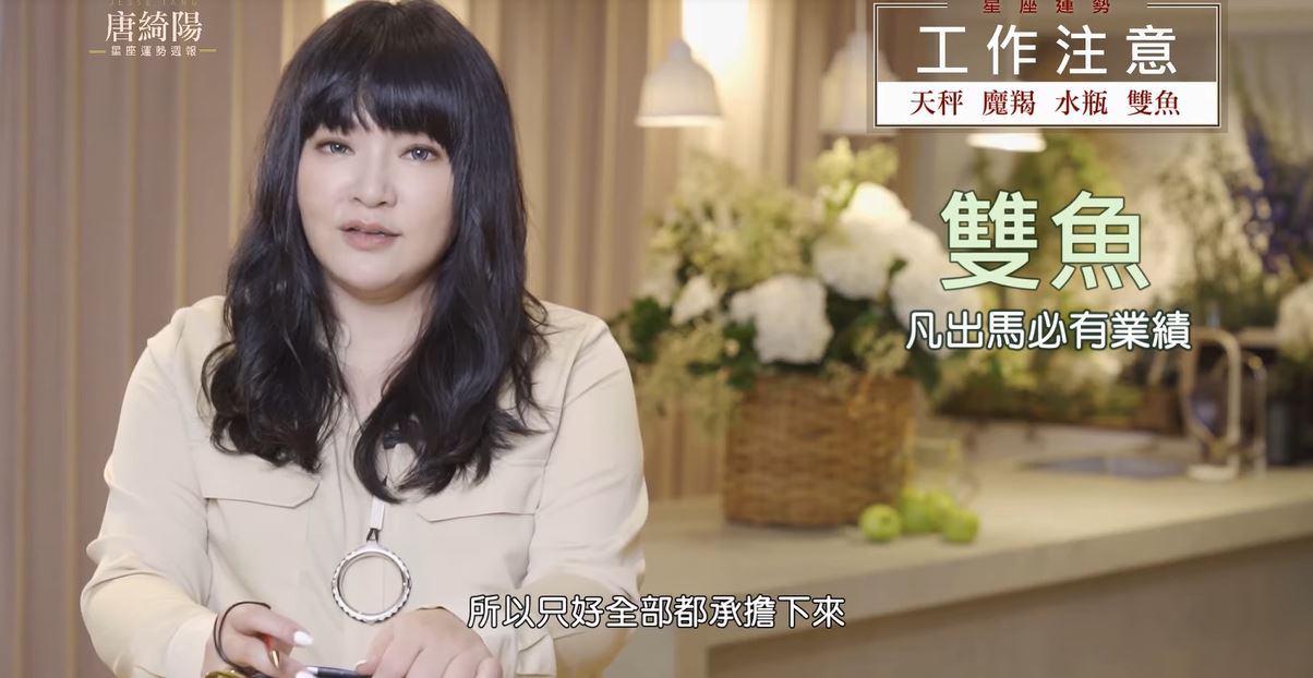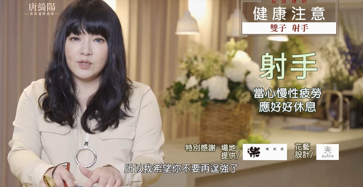 雙魚座的阿翔,唐綺陽透露,雙魚座要特別注自工作上的問題,強調這週會非常的辛苦,舟車勞頓,很多東西必須身體力行,但因為凡出馬必有業績,「所以只好全部都承擔下來」。而射手座的謝忻,唐綺陽則透露,射手座最近的精神沒有以前那麼好,有免疫力下降的情況,「這些都是在不知不覺當中累過頭的關係,所以我希望你不要再逞強了,好好休息吧!」