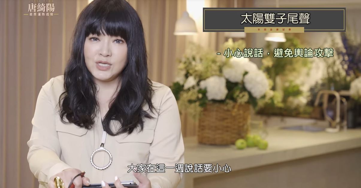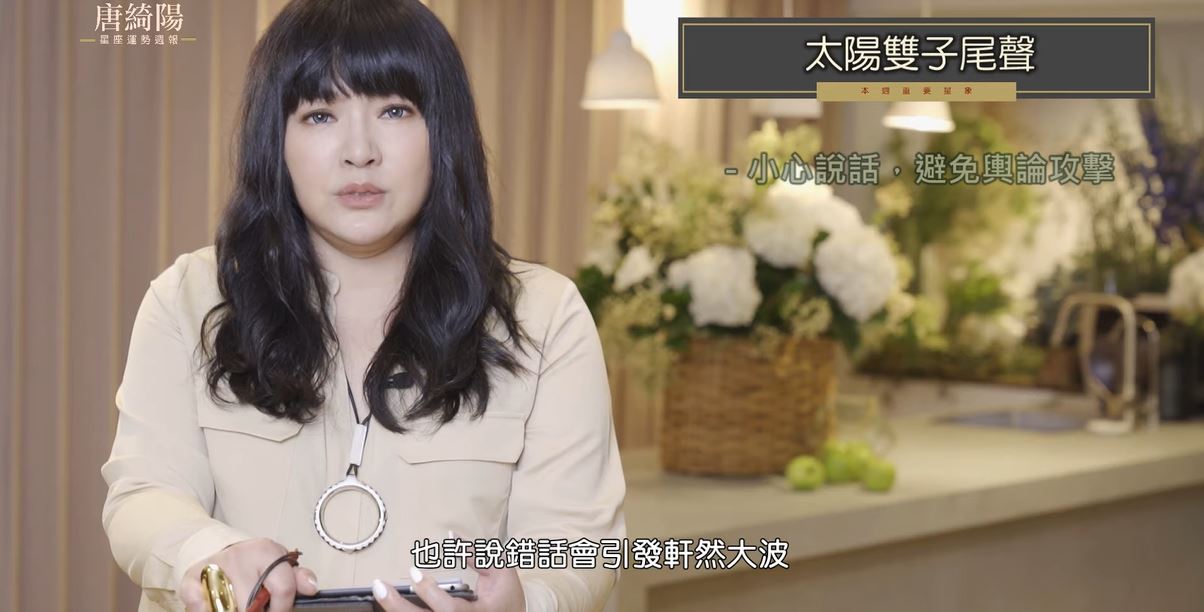 唐綺陽透露,這週要小心說錯話,「也許說錯話會引發軒然大波」,且事情經過宣傳可能越來越走樣,導致遭到輿論的攻擊;而那些逃避已久的問題也開始逐漸浮上檯面,不面對都不行了!除此之外,唐綺陽也特別提醒,這週說謊的人,或者很會巧妙迴避的人都要特別當心了,「以前很能夠隻手遮天的事情現在已經不行了!」也意味著將會看到許多事情的真相。