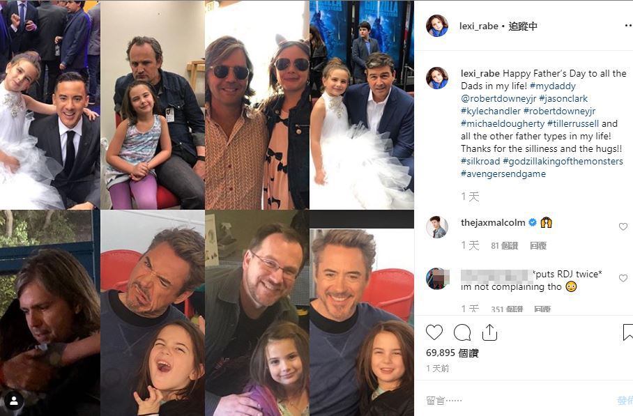 而16日,適逢美國父親節,Lexi也在IG感謝他入行以來「所有的爸爸」,包括小勞勃道尼和飾演《哥吉拉2》的男主角凱爾錢德勒(Kyle Chandler),以及2017年上映的驚悚片《Silk Road》中的男角傑森克拉克(Jason Clark)。