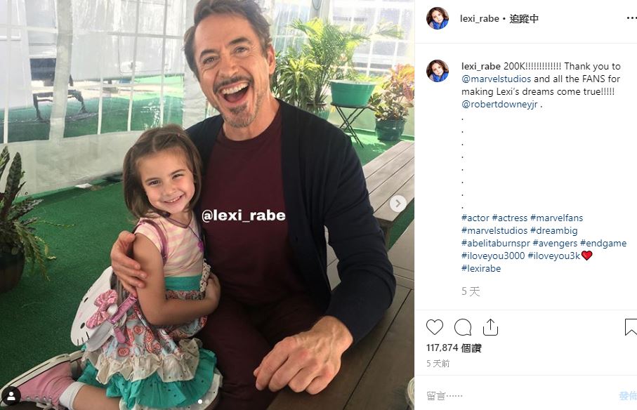 因演出《復仇者聯盟4》鋼鐵人和小辣椒女兒「摩根史塔克」(Morgan Stark)而爆紅的6歲童星Lexi Rabe,以一句台詞「我愛你3000遍」成為全球影迷廣為流傳的金句,近期他的官方IG追蹤人次更突破20萬。為此,Lexi也放送福利照感謝粉絲公開他和小勞勃道尼的合照,照片中,小勞勃道尼將Lexi緊摟在懷中,兩人笑得相當開心,Lexi也在文中標記小勞勃道尼和漫威工作室的IG,並且在文中表示「感謝漫威和廣大粉絲,Lexi的夢想成真了」。