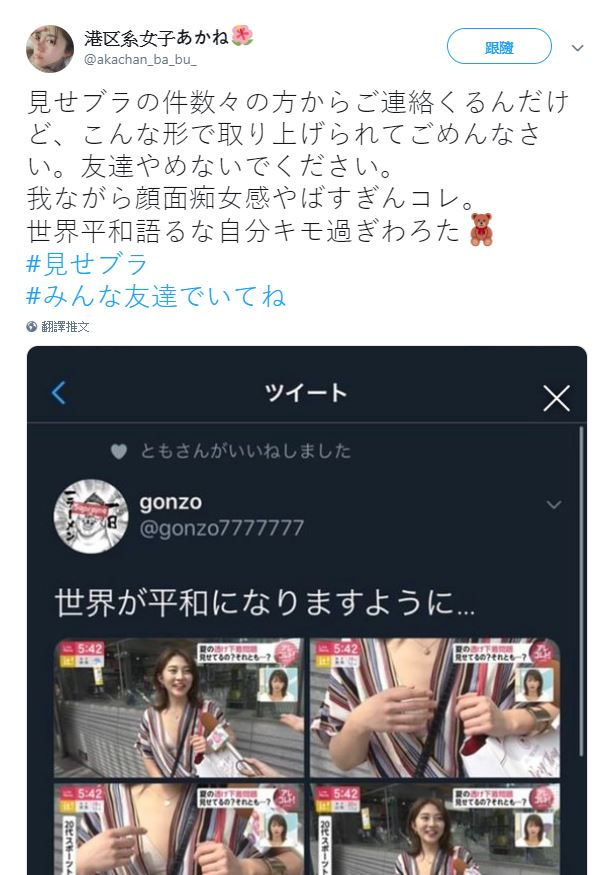 隨著炎炎夏日到來,路上可見不少女性為避暑而穿著布料較少的衣服,似乎也意外成為「路上美景」,近期日本新聞節目《NST Live News it !》就訪問了一位內衣外穿的女路人,該位女路人卻大方回應「希望露多一點,讓世界和平」這番言論在網路上瘋傳,事後女方竟後悔發文稱自己很噁心。