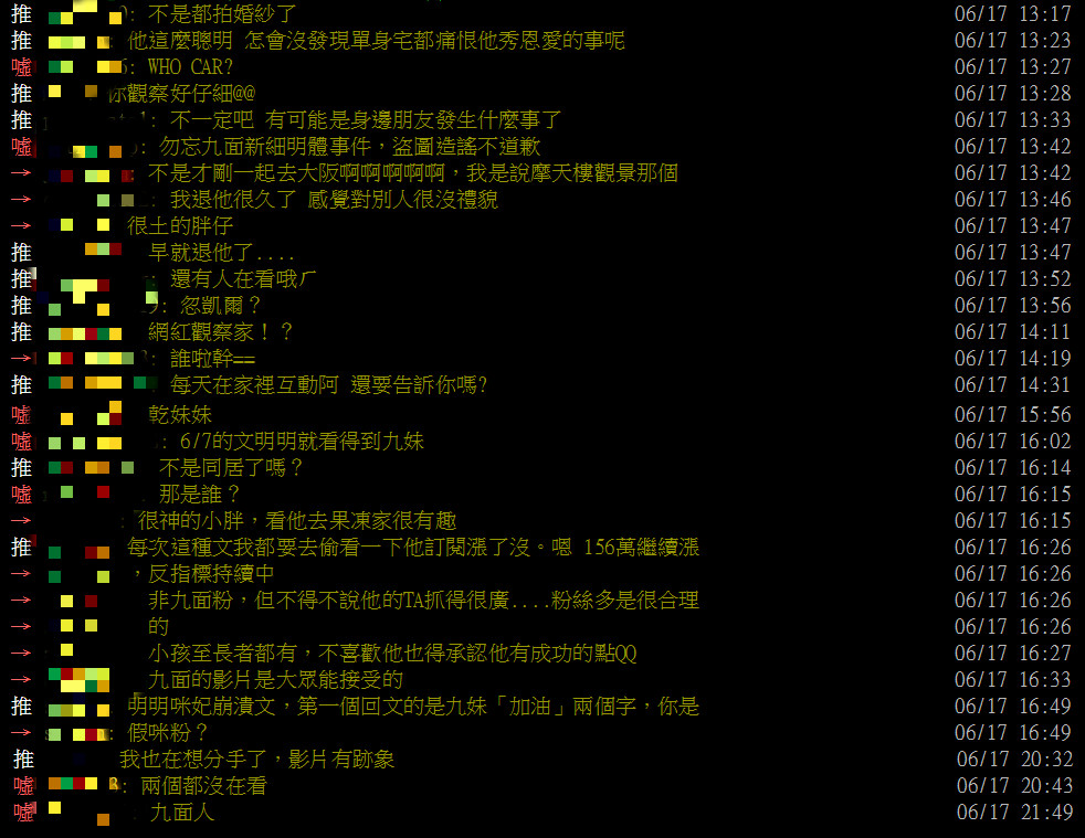 其他網友見狀後,也紛紛留言討論,「不一定吧 有可能是身邊朋友發生什麼事了」、「他這麼聰明 怎會沒發現單身宅都痛恨他秀恩愛的事呢」、「我也在想分手了,影片有跡象」、「人家又不是一定要銀幕上秀恩愛 你很愛看嗎」、「不是同居了嗎?」、「每天在家裡互動阿 還要告訴你嗎?」、「不是才剛一起去大阪啊啊啊啊啊,我是說摩天樓觀景那個」。