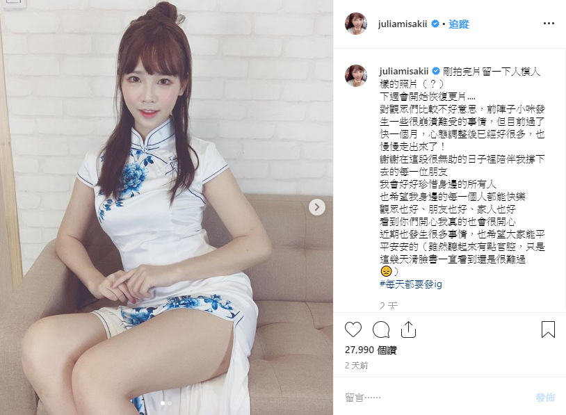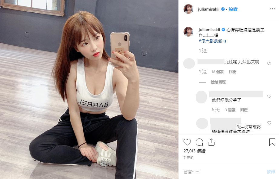 事實上15日時咪妃才在自己IG中發布了一篇「崩潰文」,文中她寫道:「前陣子小咪發生一些很崩潰難受的事情,但目前過了快一個月,心態調整後已經好很多,也慢慢走出來了!」,對此有網友留言看到九妹在下方留言「加油」,不過筆者重新檢視了一百多則留言,並沒有看到九妹的身影,反倒是11日的貼文,便有網友猜測兩人分手。