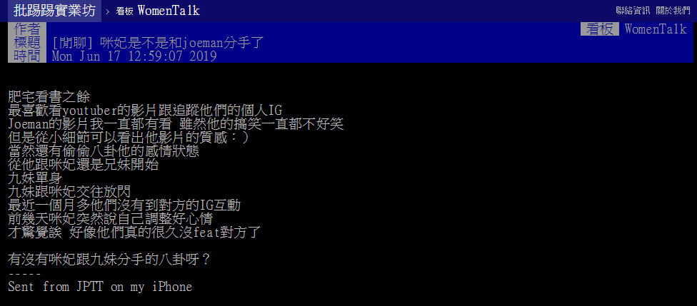 近日有網友在PTT發文:「咪妃是不是和Joeman分手了」,原PO表示自己一直以來都有在看九妹的影片,對於九妹和咪妃的戀情也十分關注,不過現在卻發現兩人近來疑似沒有甚麼互動,「最近一個月多他們沒有到對方的IG互動,前幾天咪妃突然說自己調整好心情,才驚覺誒,好像他們真的很久沒feat對方了,有沒有咪妃跟九妹分手的八卦呀?」