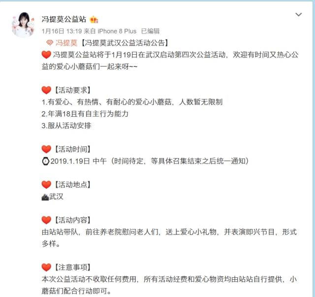 在今年1月時,馮提莫成立了「馮提莫公益站」,也開啟了一連串公益活動,像是:前往養老院慰問老人們、表演餘興節目等活動,馮提莫也會號招粉絲們一起共襄盛舉。然而其實在馮提莫公益站成立之前,馮提莫就已經參與了不少公益活動,像是:直播查酒駕、佛坪公益、人民幣科普等等這些公益活動都深得網友認可。而她也時常會在直播的時候傳遞正能量,是一個相當正面的網紅。