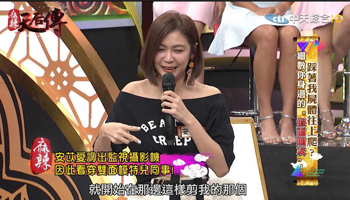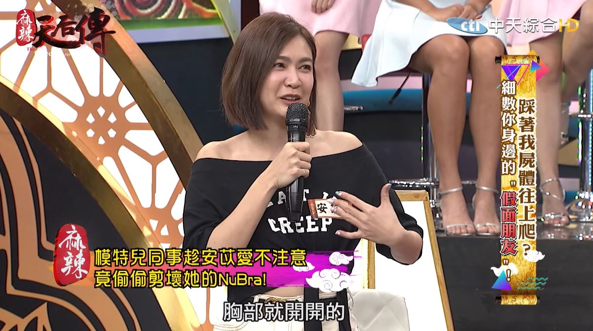 當時所有人都很慌張,她也知道兇手一定在演,「很像在玩狼人殺!」她仔細觀察大家的表情,但卻看不出個所以然。當天她的服裝就是必須黏NuBra,沒想到卻被剪破,導致她穿起衣服胸部看起來都開開的。事後她越想越不不對勁,於是求助製作單位,發現休息室裡面是有攝影機的,一看竟然驚見,就是那個她以為人很好的女生!「我那時候就覺得我好像在看鬼片!」只見對方拿著剪刀一刀一刀的剪著她的NuBra,讓她看了嚇壞,但安苡愛最後還是選擇了原諒,這名女生也因為用過太多心機手段,現在已經淡出模特兒圈。