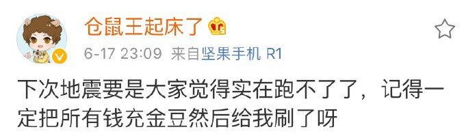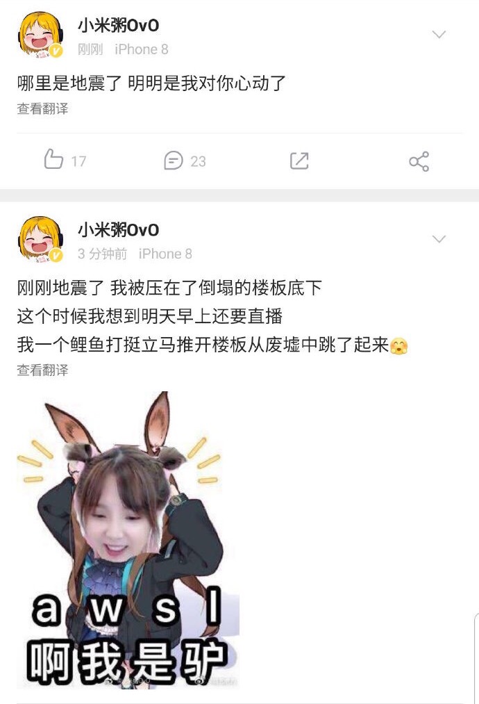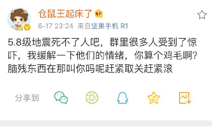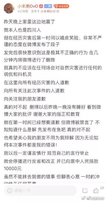 發生地震的同時,中國遊戲實況主「倉鼠王」、「小米粥」在微博上發表調侃四川地震的言論,倉鼠王在微博上表示:「下次地震要是大家覺得跑不了了,記得把所有錢充金豆(虎牙直播虛擬道具)然後給我刷了呀」、「5.8級地震死不了人吧,群裡很多人受到了驚嚇,我緩解一下他們的情緒。」;小米粥直播主也發文指出:「哪裡是地震了,明明是我對你心動了」、「剛剛地震了,我被壓在了倒塌的樓板底下,這個時候我想到明天早上還要直播,我一個鯉魚打挺立馬推開樓板從廢墟中跳了起來」。在面對地震發生的同時,卻無視災害所帶來的災情及影響,玩笑一講出,立刻引起大批網友的怒火,紛紛要求懲處這兩名直播主。