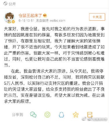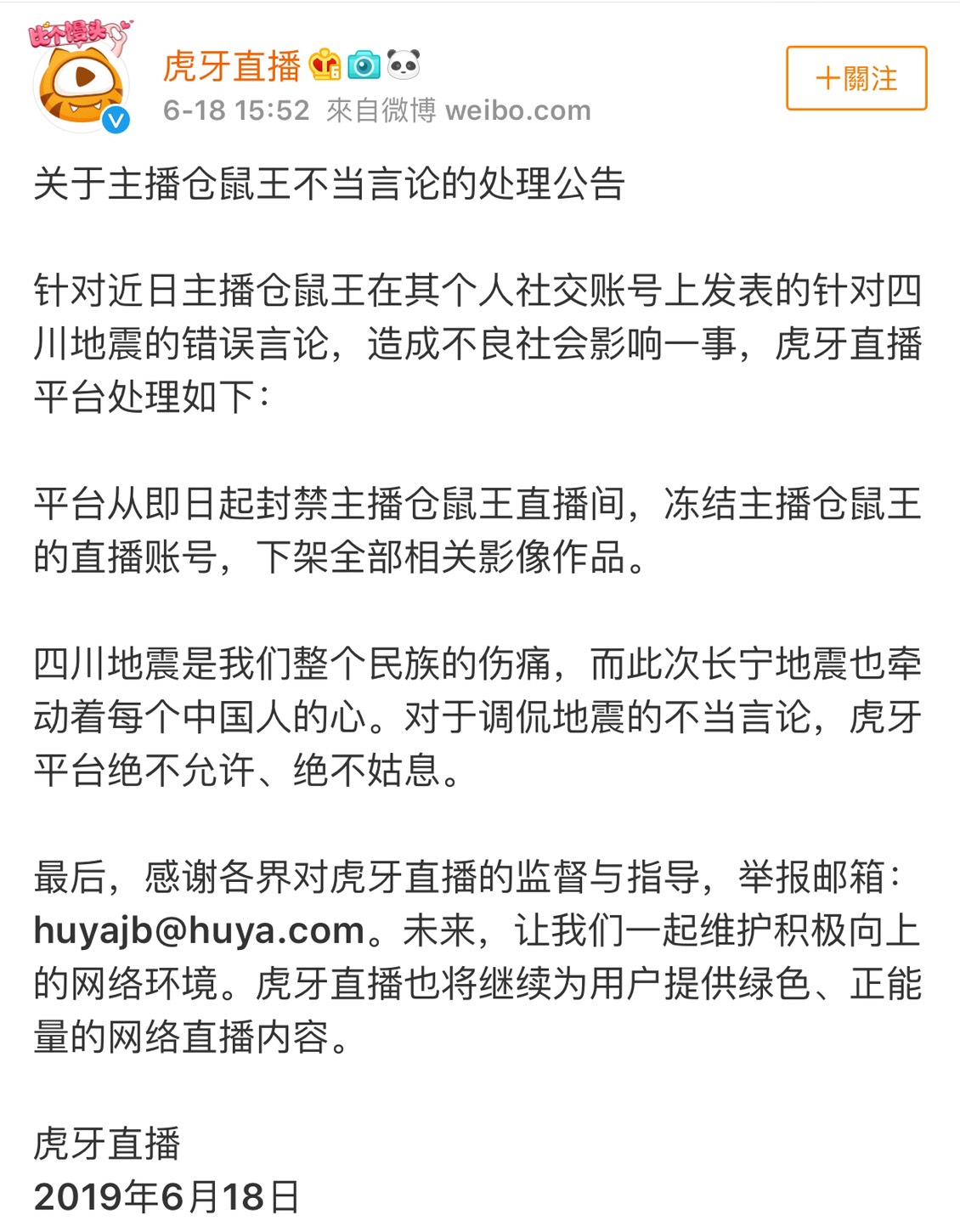 倉鼠王是虎牙直播「絕地求生」的實況主,累積粉絲數高達131萬人,在直播界小有名氣,同時觀看人數更可達到數十萬,十分驚人;小米粥則是鬥魚直播「英雄聯盟」的實況主,也擁有30萬的大批粉絲,外表可愛吸引了不少粉絲,遊戲實力也很強悍。兩人儘管已緊急發表道歉聲明並刪除貼文,各自向災區捐款,仍然平息不了怒火。鬥魚直播第一時間將小米粥的視頻關掉,但並未對小米粥調侃四川地震一事出面回應,虎牙直播則是在(18)日發布公告,即日起封鎖倉鼠王的直播頻道,凍結直播帳號,下架所有相關影像作品。虎牙直播也強調「對於調侃地震的不當言論,虎牙平台絕不允許、絕不姑息」。