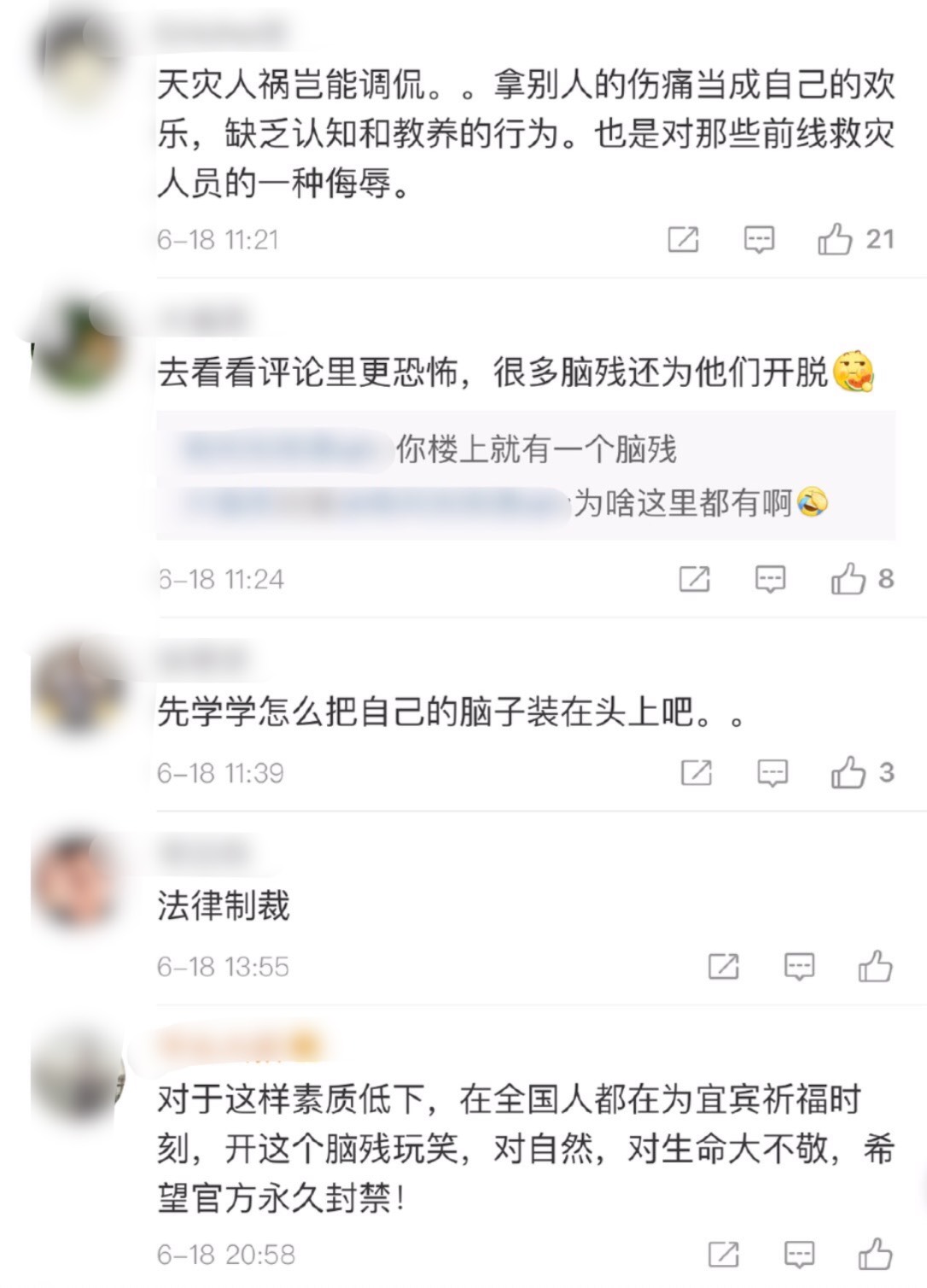 據報導,四川宜賓市公安局網絡安全保衛支隊發微博稱,兩名遊戲主播因調侃宜賓地震,目前帳號已被封禁,點進去微博只能看見:「該主播涉嫌違規,正在整改中」。網警提醒,主播要有自己的操守和良知,不能為了流量而踐踏道德底線,網絡不是不法之地。網友則痛罵:「拿別人的傷痛當成自己的快樂缺乏認知和教養行為」、「全國人都在宜賓祈福同時對自然、對生命大不敬」、「希望官方永久封殺」。