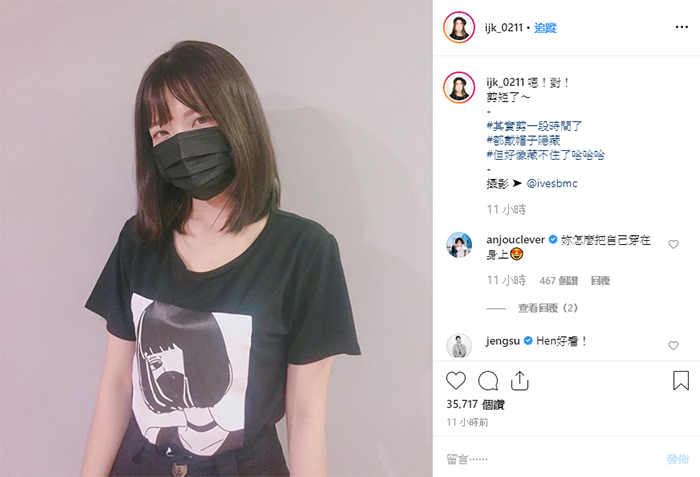 關關昨(19)日在IG中上傳一張短髮照片,「嗯!對!剪短了~」,她也透露其實已經剪短一段時間了,這短時間都戴帽子隱藏,不過因為藏不住只好自己公開。只見照片中的她,已經不見過去的及胸長髮,反而變成剛好到肩膀的長度,十分俐落漂亮。另一方面也有很多人注意到關關的衣服正好是短髮女生戴著黑色口罩,就連瀏海都與關關相似,也成為照片中的亮點,安啾還搞笑留言:「妳怎麼把自己穿在身上」。