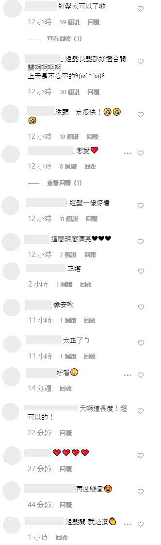 其他網友也紛紛留言大讚:「短髮太可以了啦」、「短髮長髮都好適合關關啊啊啊啊,上天是不公平的」、「短髮一樣好看」、「這麼辣麼漂亮」、「短髮豪豪看」、「黑色的天使」、「太正了ㄅ」、「最近大家都剪頭髮了啊 更加正了」、「正到不行」、「再度戀愛」、「天啊這長度!超可以的!」