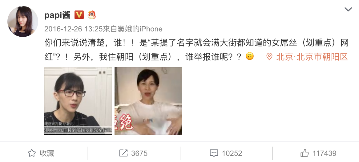 在2016年12月23日晚間,北京警方在某俱樂部中查獲有一大群人在裡面進行非法性交易的活動,隨後在微博上流傳出一份被抓嫌疑人名單,多位網紅、互聯網高層與投資人都在名單內,當時有大V爆料「影射Papi醬賣身」寫道:「北京聖誕節掃黃,有個超級女網紅,賣淫被抓了。整個一年,她紅透了大江南北,撈錢撈到手軟」,據悉發佈此消息的博主是一個媒體機構,再加上在名單上敘述更寫著:「提了名字就會滿大街都知道是誰的女屌絲網紅」,許多網友紛紛質疑是Papi醬。