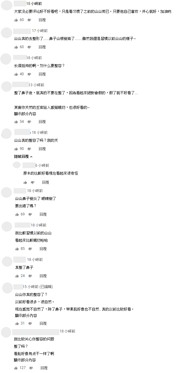 影片播出之後,網友也紛紛留言:「山山真的去整形了......鼻子山根變高了........雖然我還是習慣以前山山的樣子~」、「整了鼻子後,就真的不要再整了,因為看起來絕對會假的,假了就不好看了...」、「山山真的整容了嗎?我的天」、「我比較習慣以前的山山 看起來比較親切哈哈」、「真整了鼻子」、「真的以前比較好看」,還有網友認為眼睛也有不一樣,不過山山並沒有多做回應,IG也沒有更新近照,究竟是真的整形僅是妝容所致,目前仍是未知數。