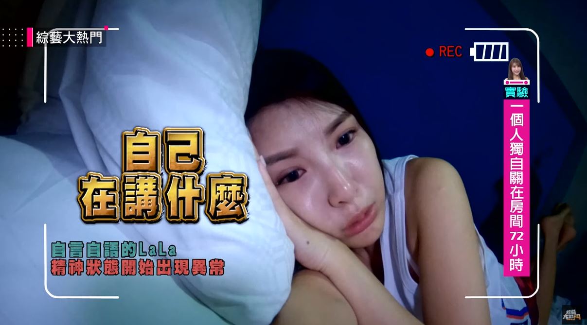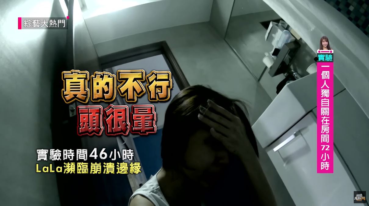 到了第34個小時,LaLa情緒開始出現異常,不僅開始自言自語,整個人充滿負能量,對鏡頭講著講著還突然哭了起來。但為了讓自己打起精神,LaLa開始拿著攝影機又唱又跳,在房裡跳來跳去。到了第40個小時後,LaLa身體開始出現狀況,不僅頭很痛、很暈,還很想吐,最後真的忍不住,衝到廁所趴在馬桶邊狂吐,情緒遊走在崩潰的邊緣。