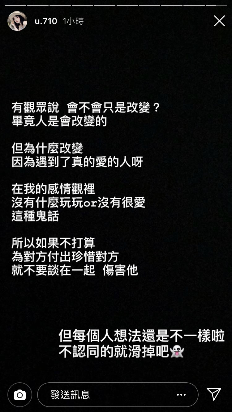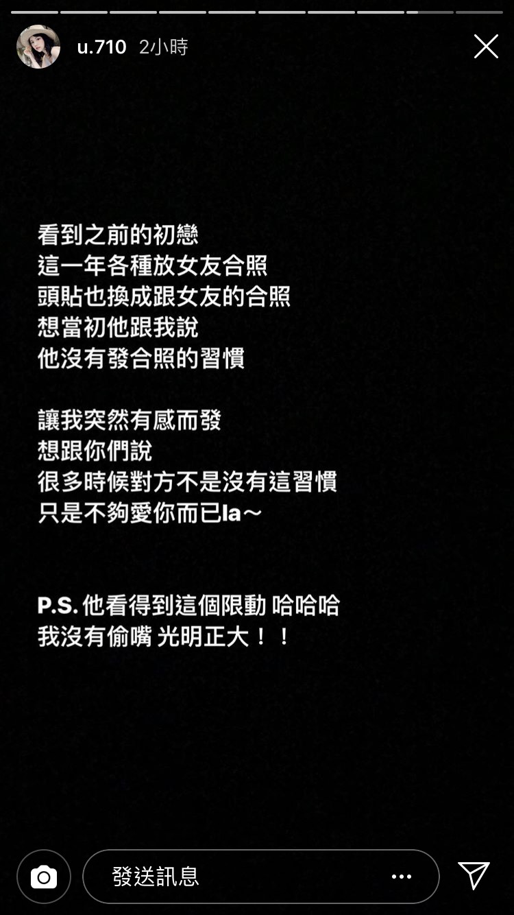 許瑜19日在IG限時動態中發文,提到自己看到初戀的IG放滿和女友的合照,就連頭貼也是,讓她無奈打上:「想當初他跟我說,他沒有發合照的習慣」,她也接著表示:「讓我突然有感而發,想跟妳們說,很多時候不是對方沒有這習慣,只是不夠愛你而已啦」。