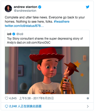 不過這項推論一出,網友看法兩極,有人認定《玩具總動員》系列的隱藏故事比悲傷更悲傷,但也有人覺得這是無稽之談,因為曾任《玩具總動員》系列編劇的安德魯‧史坦頓嚴正駁斥這說法,直呼「這完全就是假新聞,大家回家吧,這沒什麼好看的。我一直都在現場製作。」究竟真相為何?也許《玩具4》裡會再拋出一些隱藏訊息也不一定。