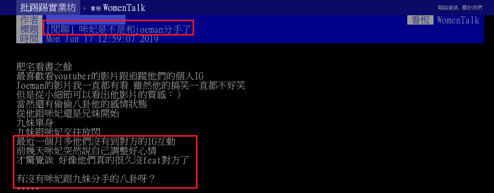 近期,有網友在PTT上發文,以「咪妃是不是和Joeman分手了」為題,文中指出雙方近一個多月都沒有互動,而且也不再出現在彼此的影片中,除此之外,「咪妃」更於本月15日PO文透露自己遭遇到了「很崩潰難受的事情」,更表示「過了快一個月,心態調整後已經好很多,也慢慢走出來了!」,引發許多的揣測,還有人直接在「Joeman」的IG版面上直問「為何最近都沒有咪妃」,卻沒得到回應。