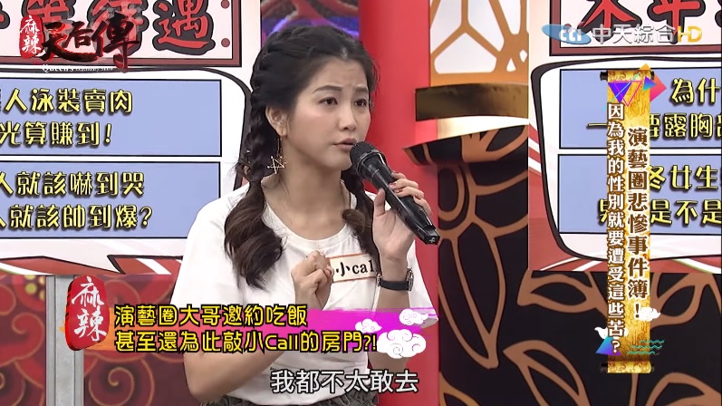 《麻辣天后傳》節目談話內容包羅萬象,最近談論到「演藝圈悲慘事件簿!因為我的性別就要遭受這些苦?」來賓包括小Call、趙心姸、黃雨欣等人,大談演藝圈不公平的事情,小Call提到,她之前出外景被要求在水中跳繩,且規定女生要下水玩,但她認真在玩遊戲,沒有發現泳衣被掀起,「乳暈就露出一半在外面。」