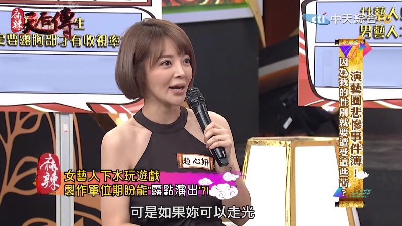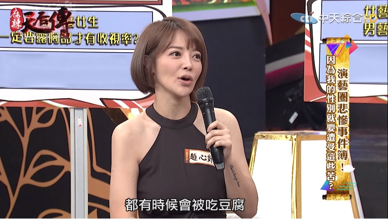 女藝人貼胸貼是以防走光,但趙心姸表示,會被要求「假性曝光」,鏡頭已經事先預備,工作人員還會告訴她要在哪裡落水,方便拍攝。此外,趙心姸透露在過去曾碰到收工或是錄影中間時,被其他男藝人吃豆腐,當時對方突然從後方伸手,直接摸她的腰部,她當下也只能傻笑,且腳步快一點,對方仍會跟上來,她回想忍不住喊:「很噁心!」
