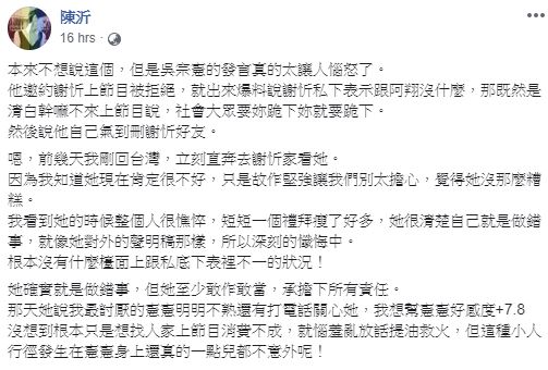 陳沂在臉書透露,前幾天回到台灣就趕到謝忻家關心,透露謝忻現在整個人非常憔悴,且短短1周瘦了一大圈。但吳宗憲卻提油救火,要謝忻上節目說明,還說清白就應該上節目講,要妳下跪就要下跪,否則就是對人家家庭的二度傷害,讓陳沂氣得直說,吳宗憲根本是想消費謝忻。