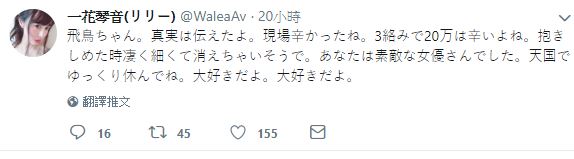 33歲日本女優愛田飛鳥(あいだ飛鳥)以纖細腰圍和不科學上圍知名度大增,23日,經由同業好友一花琴音(舊名 寶生莉莉)證實,從日本東京五反田的高樓跳下輕生,更指控所屬事務所疑似壓下愛田飛鳥的死訊,並公開女優「低片酬」的生態,消息一出令外界不勝唏噓。