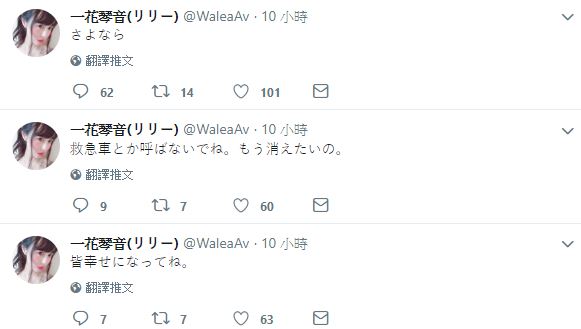 然而18日,一花琴音也早在推特發文表示「罹患子宮頸癌」,目前已經積極接受治療,不過今(24)日一早卻一連發出3則憂鬱訊息,包括「大家都應該得到幸福」、「不要叫救護車」、「再見」讓外界擔心好友愛田飛鳥的離開是否會影響到一花琴音的心情