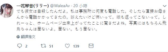 憤恨不平的一花琴音,更出面指控愛田飛鳥所屬事務所 Zeal Group(ジールグループ)疑似壓住死訊沒有刪掉愛田飛鳥的推特帳號,並抖出低片酬的醜惡生態。文中,一花琴音爆料愛田飛鳥生前拍攝的作品至今仍在販售中,因為愛田飛鳥的作品的確相當熱賣,不過一花琴音也指出愛田飛鳥實際得到的片酬卻少的可憐,他表示「一支與男優拍攝3次的作品,只能拿到20萬元日幣(約莫新台幣5.8萬)」。