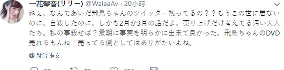 近期,網路上瘋傳日本女優愛田飛鳥(あいだ飛鳥)在2至3月,於日本東京五反田的高樓躍下輕生的消息,23日,同業好友一花琴音透過個人推特證實死訊,並表示已經和愛田飛鳥的母親連絡過。文中顯示,一花琴音多次打電話給公司,最終愛田飛鳥的母親主動聯繫一花琴音並無助表示「想提告但是覺得很害怕,而且他(愛田飛鳥)也不會再回來了」間接證實愛田飛鳥已經離世。