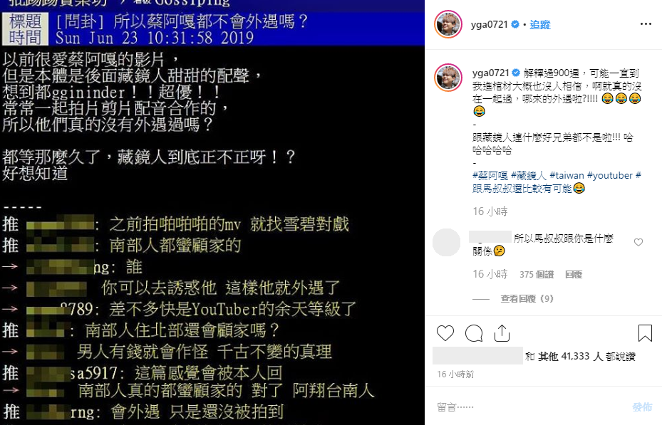 鄉民熱議「沒有外遇過嗎?」蔡阿嘎親上火線回應:跟「藏鏡人」連好兄弟都不是!