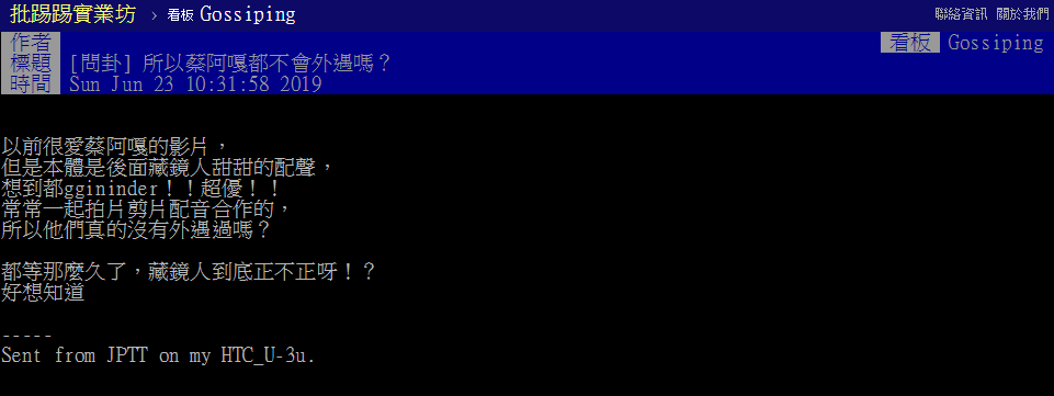 蔡阿嘎僅來因為兒子蔡桃貴的高人氣,父子二人都受到高度關注,而近日有網友在PTT八卦版發文「所以蔡阿嘎都不會外遇嗎?」原PO表示以前很喜歡藏鏡人的聲音,「常常一起拍片剪片配音合作的, 所以他們真的沒有外遇過嗎?」引起許多鄉民討論。
