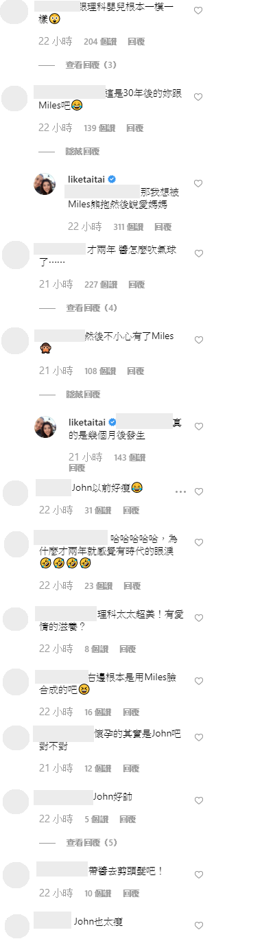 而照片上傳之後,網友也紛紛留言:「(John)跟理科嬰兒根本一模一樣」、「感覺妳都沒變依然美麗」、「John以前好瘦」、「理科太太超美!有愛情的滋養?」、「右邊根本是用Miles臉合成的吧?」、「太太真是美女John赚到了」,也有網友留言:「然後不小心有了Miles」,理科太太則回覆:「真的是幾個月後發生」。