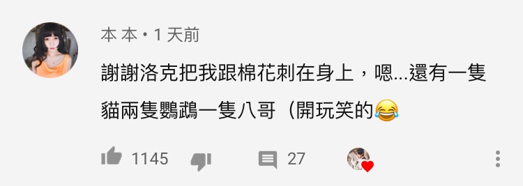 影片出來後,本本在下面留言:「謝謝洛克把我跟棉花刺在身上」,對此有網友回應:「這刺青應該就是暗示你們在交往了吧?」、「還沒交往嗎?還是已經結婚了」、「在一起了?」對兩人的關係感到非常好奇。