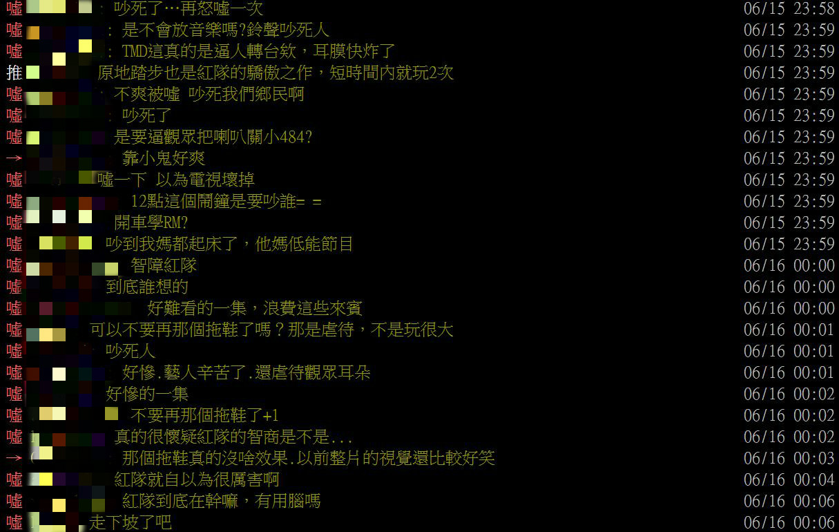 批踢踢鄉民們看了相當不滿:「聲音好吵好煩」、「這種聲音聽起來超惹火」、「我耳朵快聾了」、「吵幾點的啊低能策劃欸」、「現在半夜12點…」、「製作單位是智障嗎?」、「吵到我媽都起床了!」沒想到下集的開頭又再播了一次這個橋段,讓網友氣炸:「還來啊!」、「上週被罵還不修正」、「到底有完沒完」、「不只虐待藝人還虐待觀眾」。