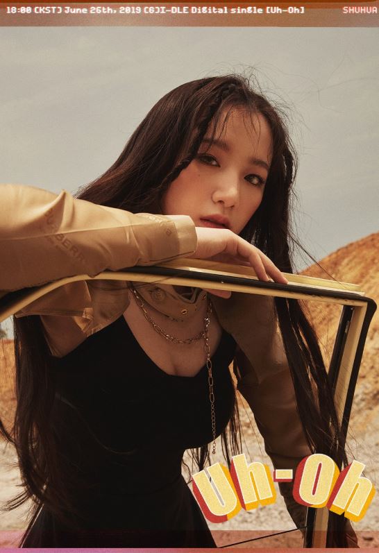 26日,韓國女團(G)I-DLE將以全新創作歌曲〈Uh-Oh〉回歸,上周也陸續公開團體和個人的預告照、影片,從中可見過去華麗時尚的風格大變,此次大展狂野魅力,以荒漠和古董作為主視覺,妝容和衣著也顯得十分成熟。其中老么舒華的個人照中,不僅嘗試煙燻妝更穿著低胸的緊身短洋,單手擱在車門上的他,豐滿上圍呼之欲出,預告影片的上衣,更是將方領以肚兜的方式單穿,露出白皙腰部相當吸睛。