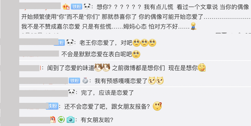 25號時,王嘉爾在微博上曬出一張健身的自拍照,並配上文字:「在 美國 現在,別擔心 ,有吃,有健身,有睡,有專心工作,蠻好的,想你」,文末附上了一個愛心的符號,然而粉絲們發現王嘉爾發文寫的是「想你」而不是「想你們」,紛紛猜測王嘉爾是不是戀愛了,崩潰留言說道:「看過一個文章說 當你的偶像開始頻繁使用『你』而不是『你們』 那就恭喜你了 你的偶像可能開始戀愛了」、「完了,應該是戀愛了」、「我有預感嘎嘎戀愛了」、「聞到了戀愛的味道,之前微博都是想你們,現在是想你」、「老王你戀愛了,對吧」,大批粉絲不斷猜測王嘉爾是戀愛了。