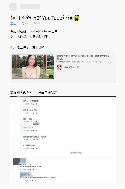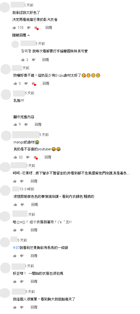 種種留言讓人看了相當傻眼,近日也有網友針對這件事在Dcard發文:「極其不舒服的YouTube評論」,原PO指出自己很喜歡芒果的影片,沒想到留言卻充滿性騷擾,「沒想到滑到下面.......真是大開眼界」,「我知道觀眾喜歡看 大部分稱讚身材很好留言也都還好,但『打手O』『想揉』『射XX』是怎樣⋯⋯我到底看了什麼......」,文章發布後,也引起不少網友討論。